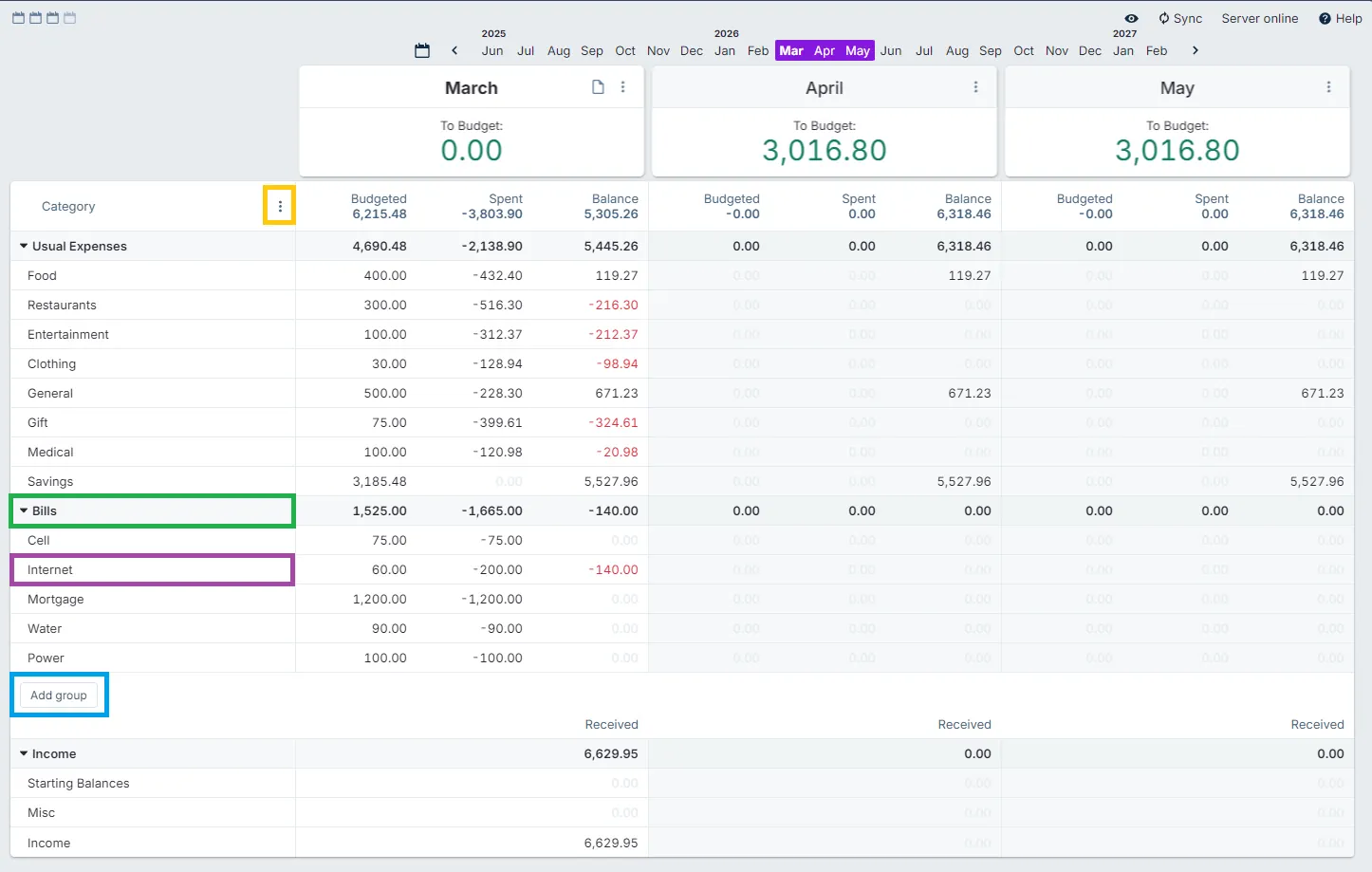 The budget detail section lists all your categories and their grouping. The image below shows two expense category groups, Usual Expenses and Bills, along with the income categories.